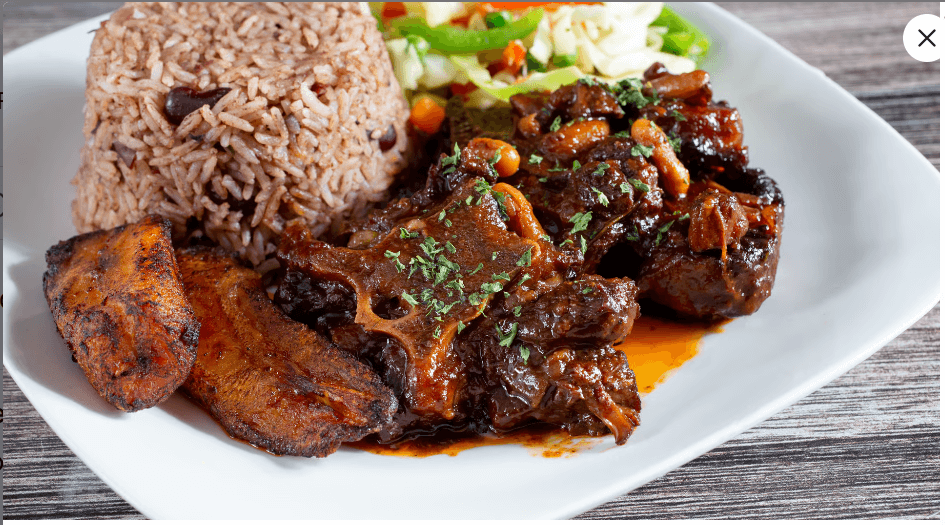 Oxtails slow-cooked with butter beans in gravy. Served with rice and peas & vegetables.
